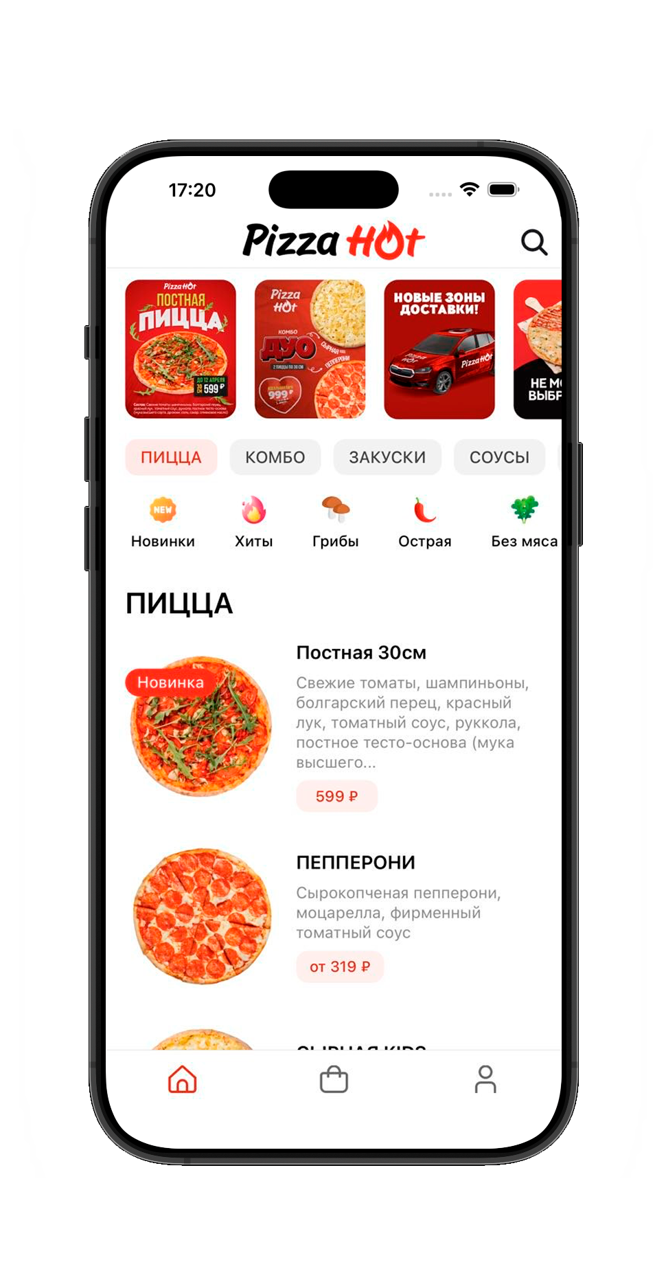 «Пепперони», «Пепперони», «Дабл Чиз», «Маргарита», «Ветчина&Грибы», «Чикен Фунге», «Карбонара», «Чизбургер», «А-ля Рэнч», «Гавайская». Все пиццы диаметром 30...